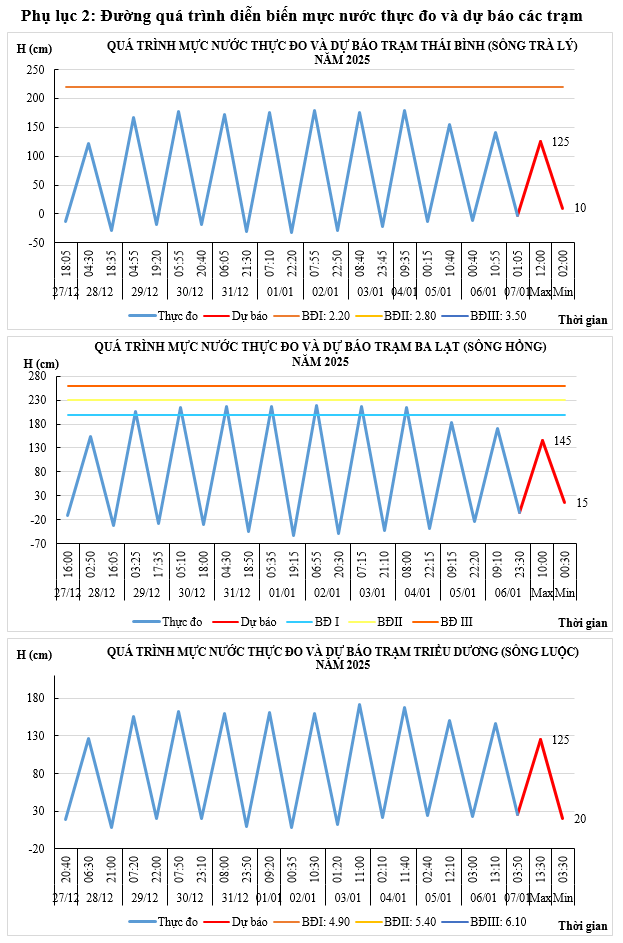 - Mực nước trên các sông Trà Lý, sông Hồng, sông Luộc chịu ảnh hưởng của thủy triều, điều tiết hồ thủy điện: xu thế xuống.