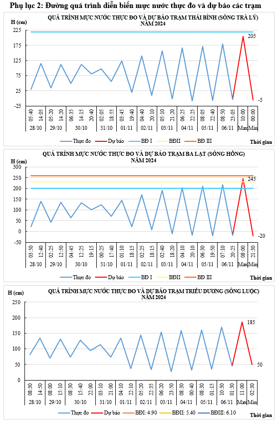 - Mực nước trên các sông Trà Lý, sông Hồng, sông Luộc chịu ảnh hưởng của thủy triều, điều tiết hồ thủy điện: xu thế lên.