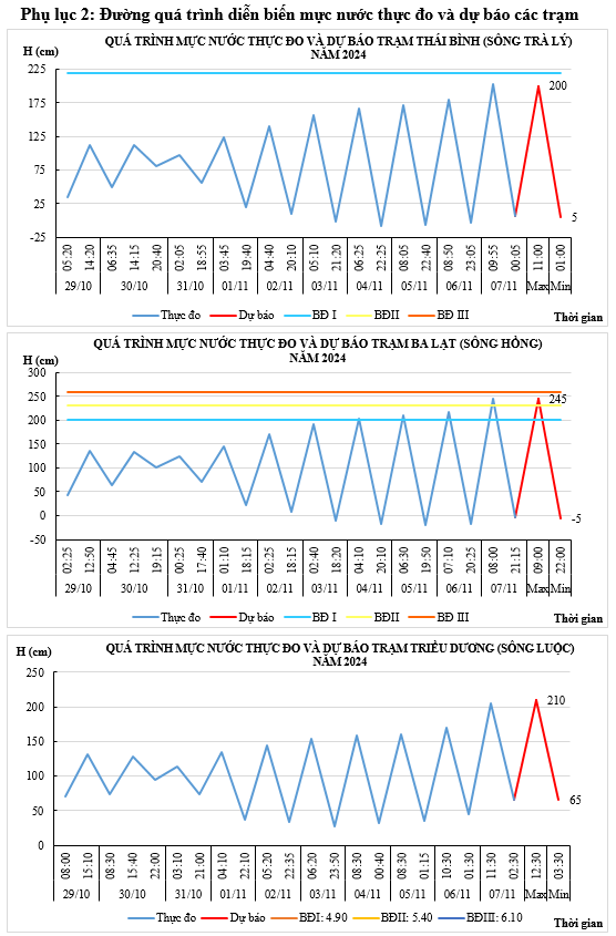 - Mực nước trên các sông Trà Lý, sông Hồng, sông Luộc chịu ảnh hưởng của thủy triều, điều tiết hồ thủy điện: xu thế lên.