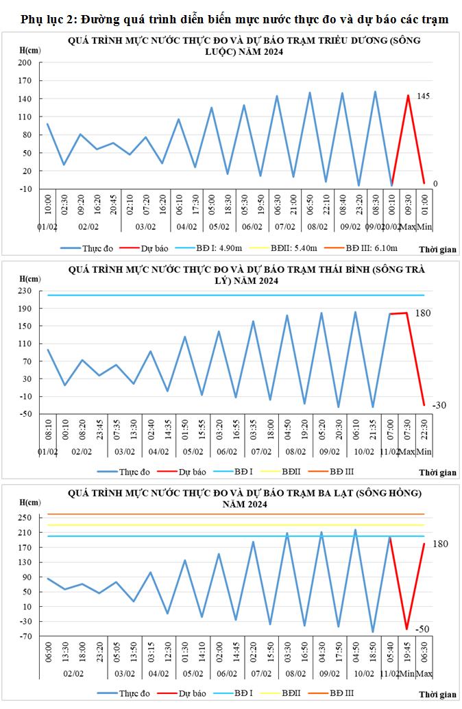 Mực nước trên sông Trà Lý, sông Hồng và sông Luộc dao động theo thủy triều, điều tiết hồ thủy điện: biến đổi chậm.