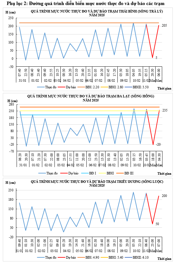 - Khả năng xuất hiện các hiện tượng thủy văn nguy hiểm trong thời hạn dự báo: Ngày 12/02 mực nước đỉnh triều trạm Ba Lạt có khả năng đạt trên báo động II.