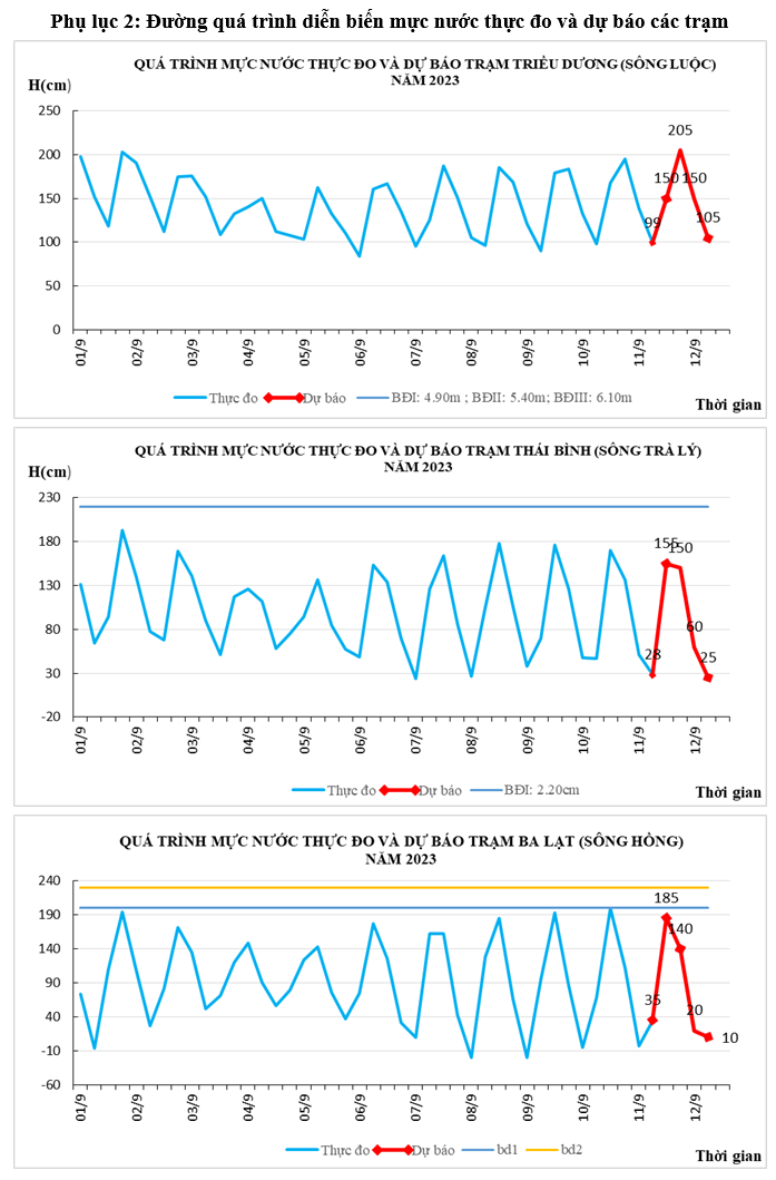 - Mực nước trên các sông Trà Lý, sông Hồng, sông Luộc biến đổi chậm và chịu ảnh hưởng của thủy triều, điều tiết hồ thủy điện.
