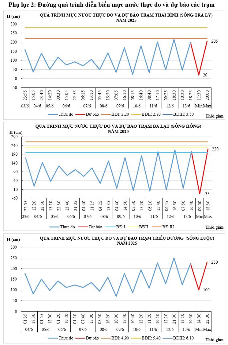 - Khả năng xuất hiện các hiện tượng thủy văn nguy hiểm trong thời hạn dự báo: Ngày 14/6 mực nước đỉnh triều trạm Ba Lạt có khả năng đạt trên báo động I.