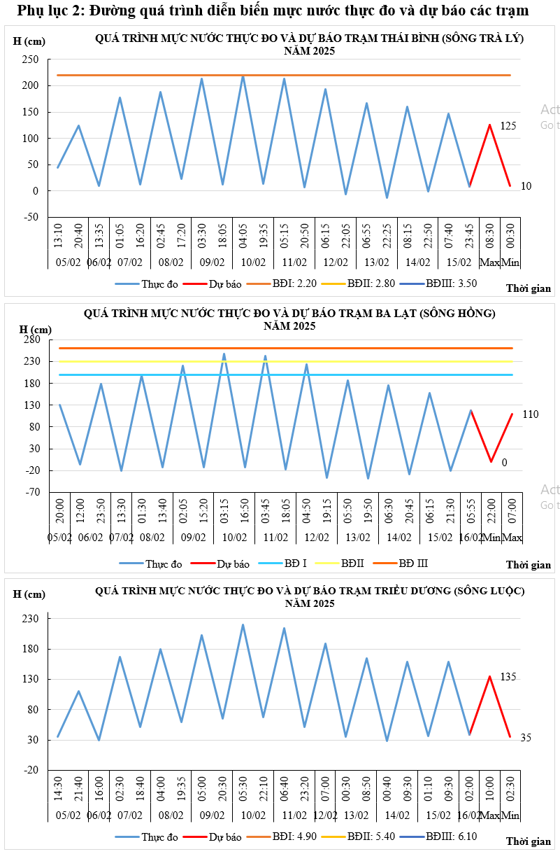 - Mực nước trên các sông Trà Lý, sông Hồng, sông Luộc chịu ảnh hưởng của thủy triều, điều tiết hồ thủy điện: Xu thế xuống.