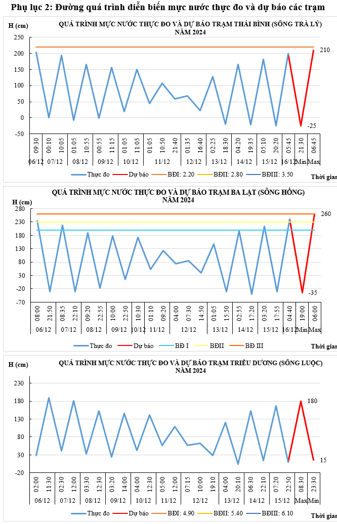 - Mực nước trên các sông Trà Lý, sông Hồng, sông Luộc chịu ảnh hưởng của thủy triều, điều tiết hồ thủy điện: xu thế lên.