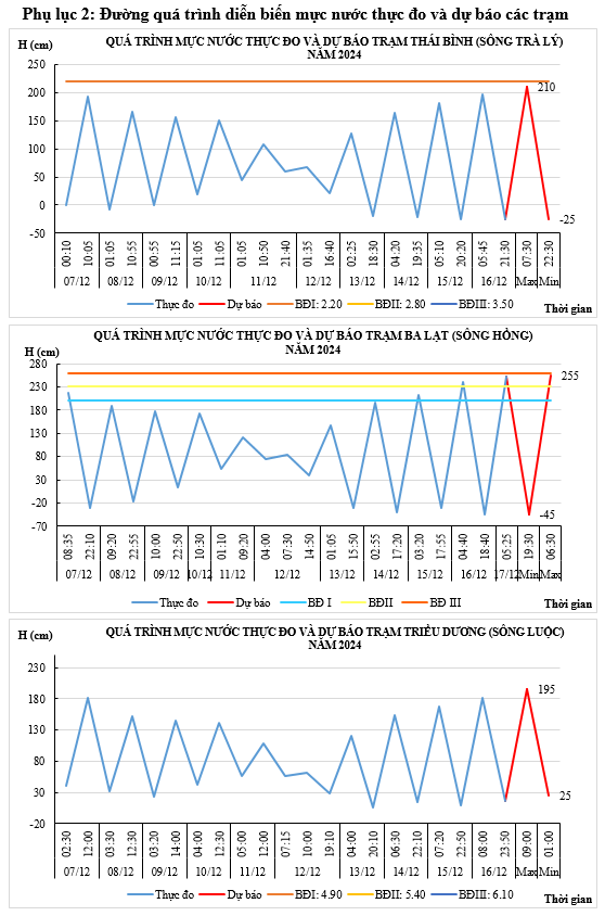- Mực nước trên các sông Trà Lý, sông Hồng, sông Luộc chịu ảnh hưởng của thủy triều, điều tiết hồ thủy điện: ít thay đổi.