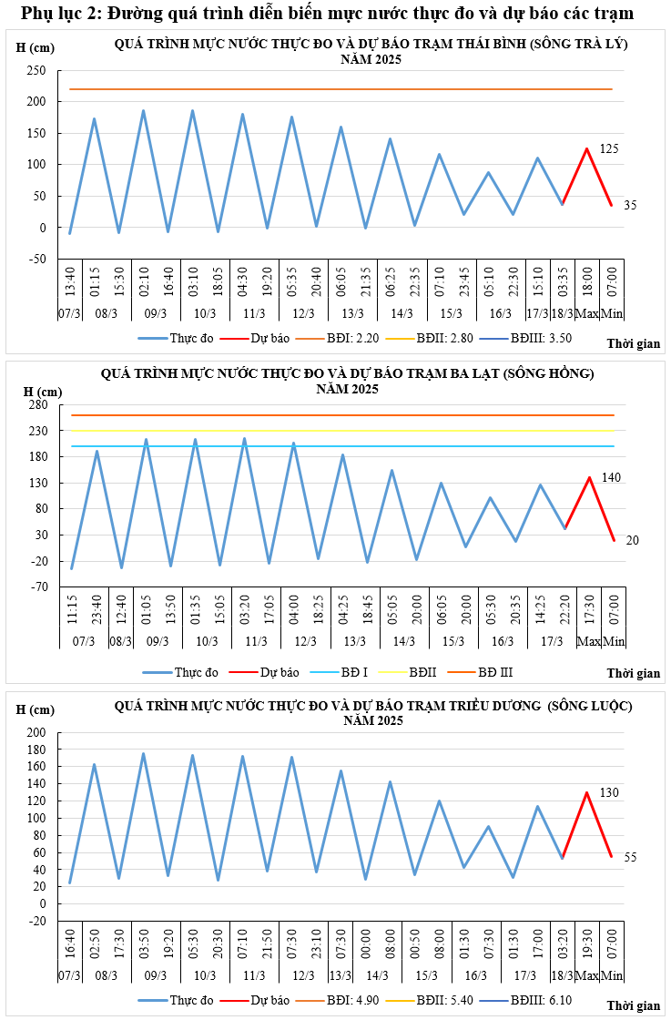 - Mực nước trên các sông Trà Lý, sông Hồng, sông Luộc chịu ảnh hưởng của thủy triều, điều tiết hồ thủy điện: xu thế lên.