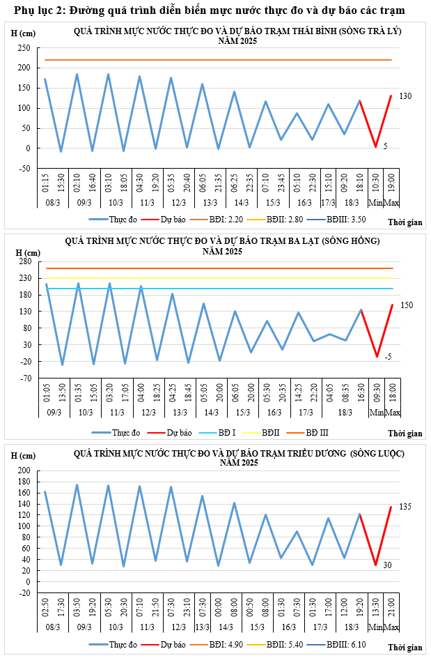 - Mực nước trên các sông Trà Lý, sông Hồng, sông Luộc chịu ảnh hưởng của thủy triều, điều tiết hồ thủy điện: xu thế lên.