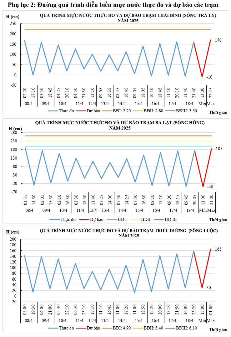 - Mực nước trên các sông Trà Lý, sông Hồng, sông Luộc chịu ảnh hưởng của thủy triều, điều tiết hồ thủy điện: xu thế lên chậm.