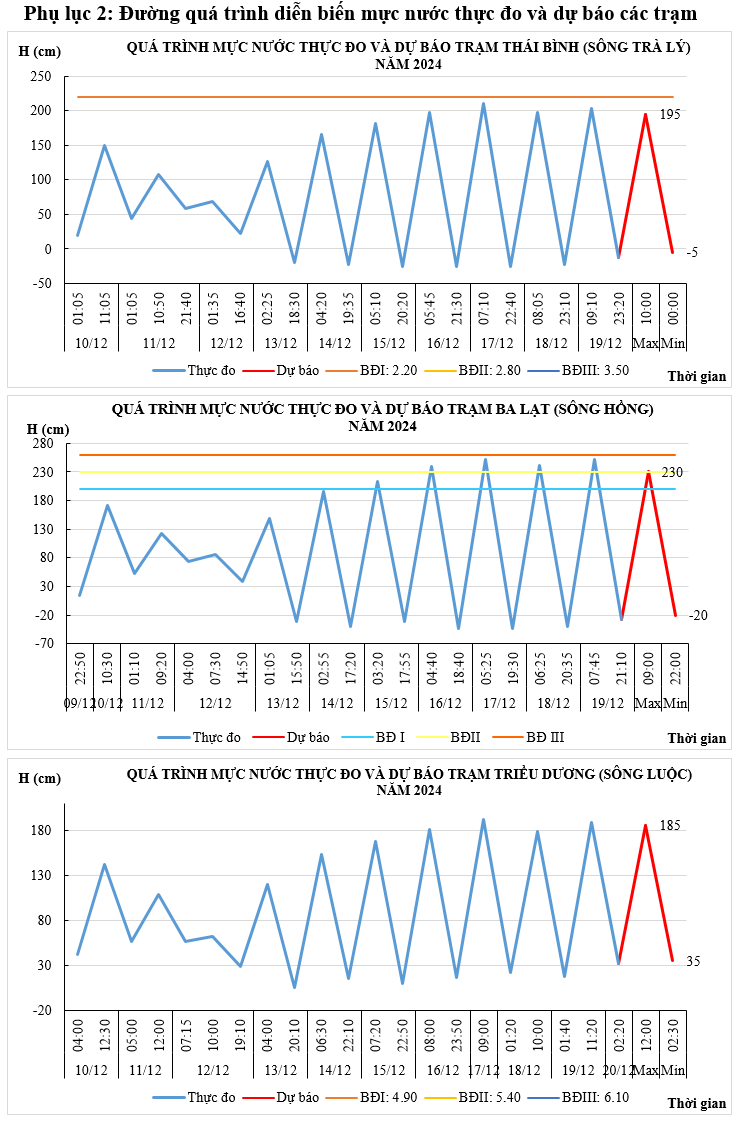 - Khả năng xuất hiện các hiện tượng thủy văn nguy hiểm trong thời hạn dự báo: Ngày 20/12 mực nước đỉnh triều trạm Ba Lạt có khả năng ở mức báo động II.