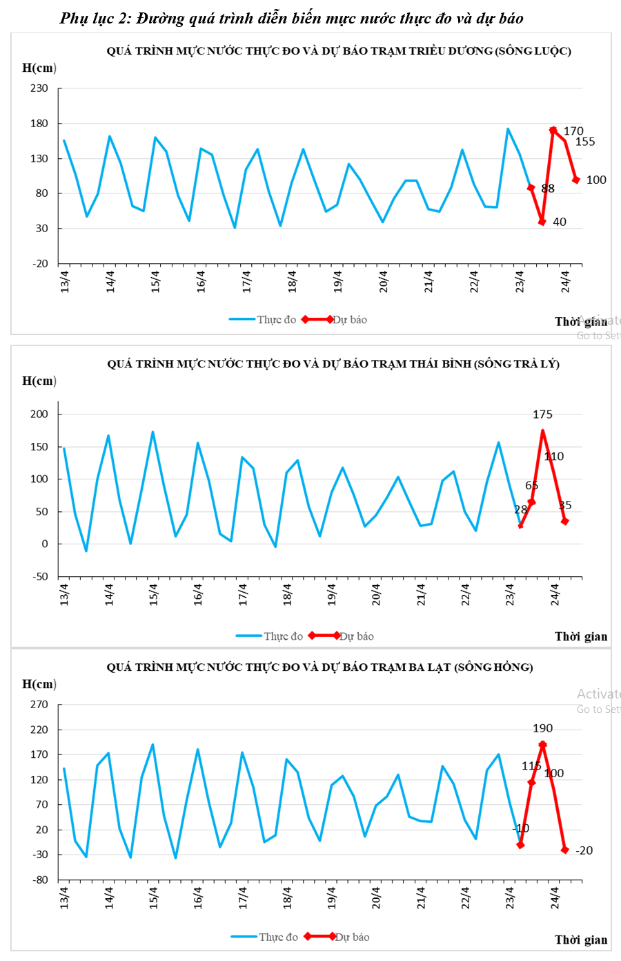 Phụ lục 1: Bảng mực nước thực đo và dự báo các trạm (Đơn vị: cm).