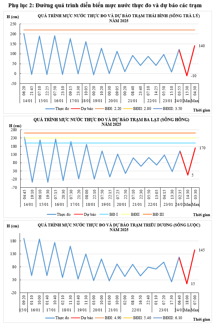 - Mực nước trên các sông Trà Lý, sông Hồng, sông Luộc chịu ảnh hưởng của thủy triều, điều tiết hồ thủy điện: xu thế lên.