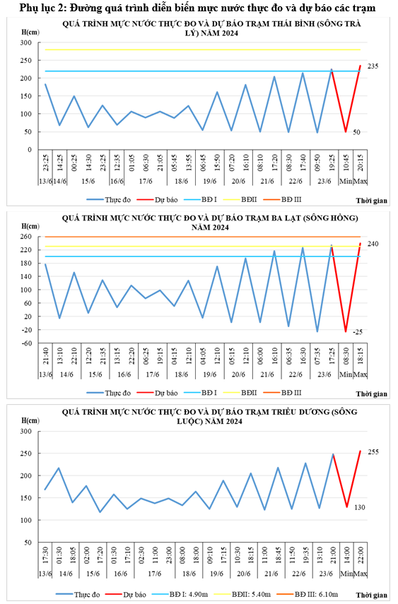 - Khả năng xuất hiện các hiện tượng thủy văn nguy hiểm trong thời hạn dự báo: Từ ngày 24-26/6 do ảnh hưởng triều cường mạnh nên mực nước đỉnh triều trạm Ba Lạt có khả năng đạt báo động II, trạm Thái Bình, Đông Quý ở mức báo động I.