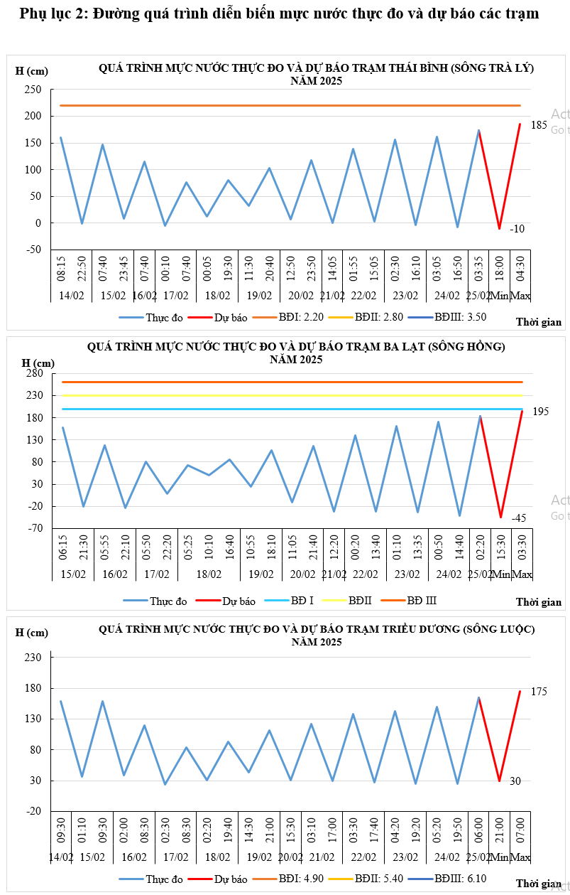 - Mực nước trên các sông Trà Lý, sông Hồng, sông Luộc chịu ảnh hưởng của thủy triều, điều tiết hồ thủy điện: Xu thế lên.