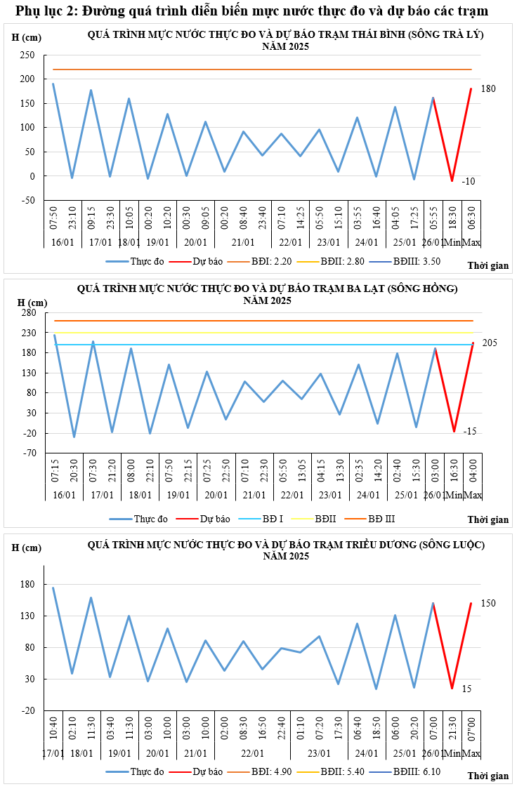 - Mực nước trên các sông Trà Lý, sông Hồng, sông Luộc chịu ảnh hưởng của thủy triều, điều tiết hồ thủy điện: xu thế lên.