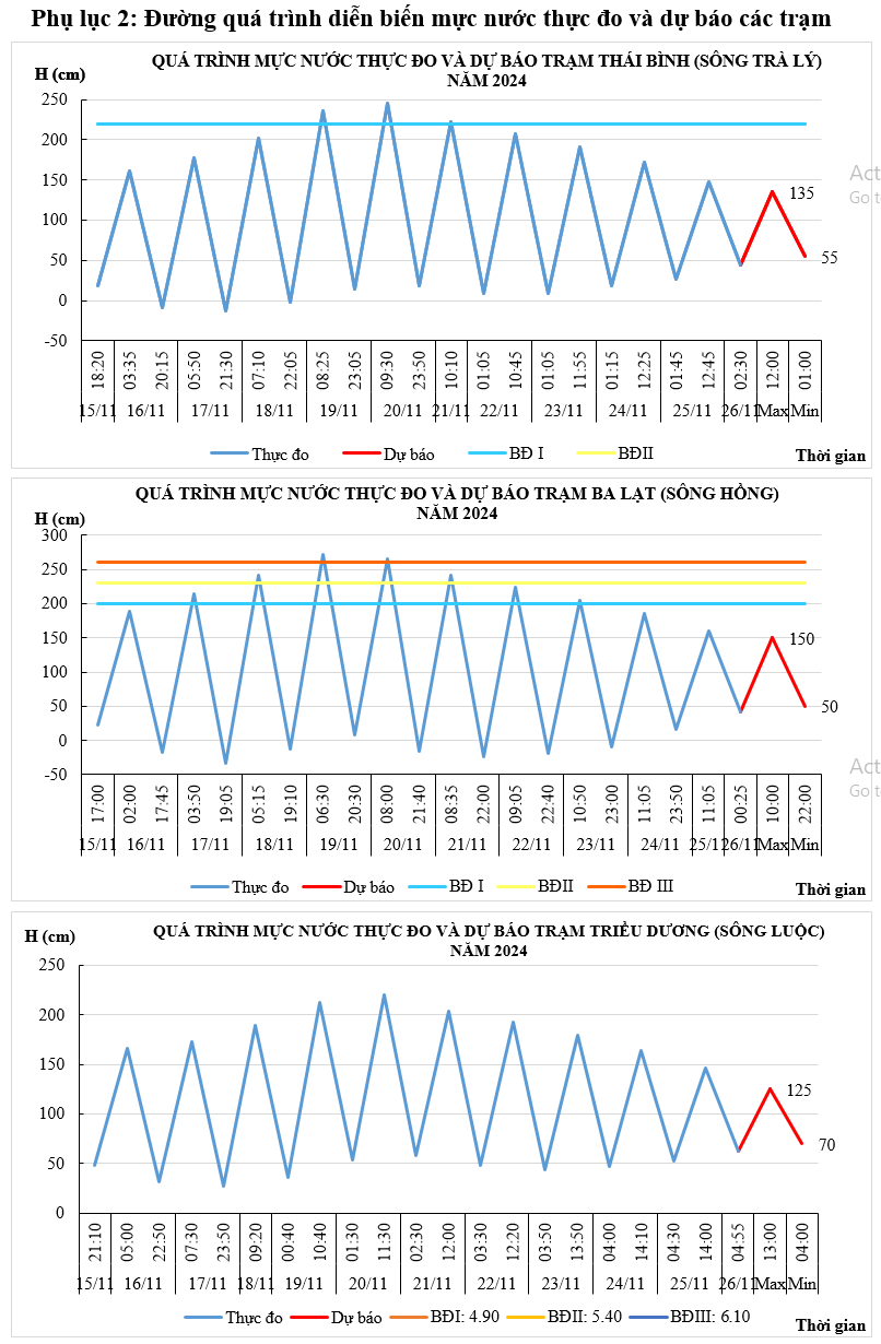 - Mực nước trên các sông Trà Lý, sông Hồng, sông Luộc chịu ảnh hưởng của thủy triều, điều tiết hồ thủy điện: xu thế xuống.