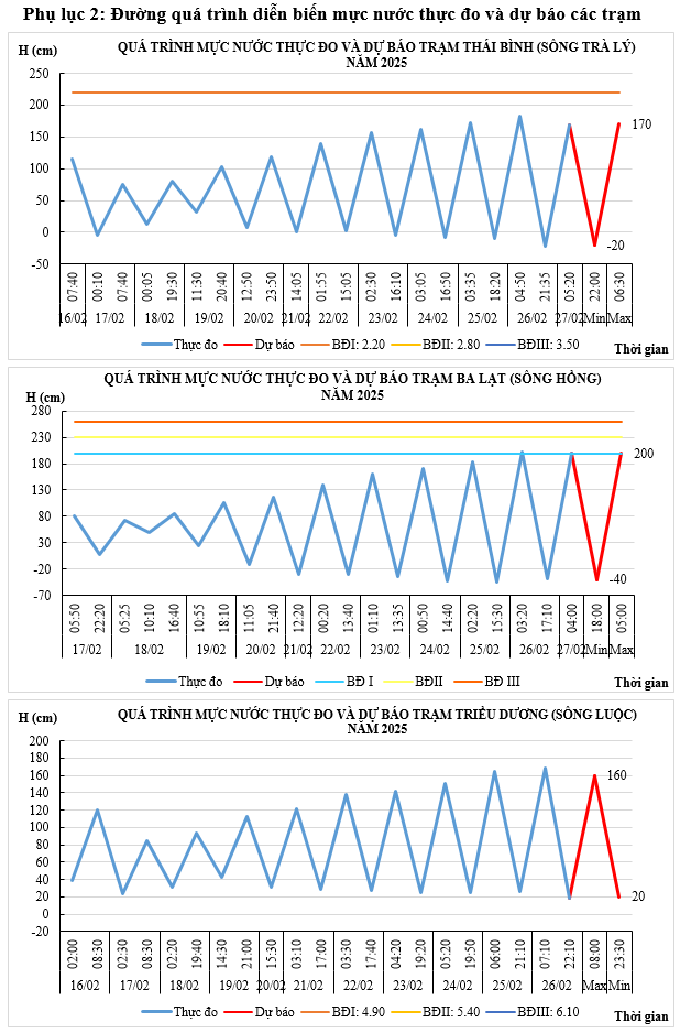 - Mực nước trên các sông Trà Lý, sông Hồng, sông Luộc chịu ảnh hưởng của thủy triều, điều tiết hồ thủy điện: Biến đổi chậm.