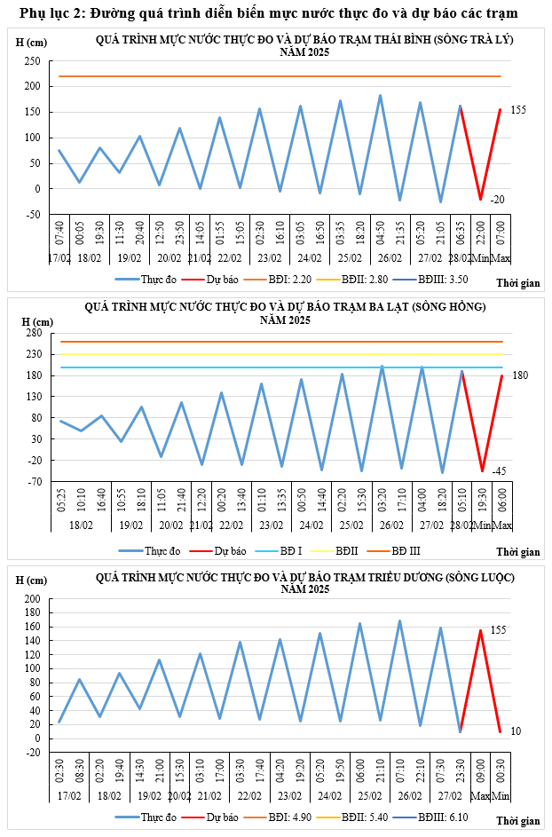 - Mực nước trên các sông Trà Lý, sông Hồng, sông Luộc chịu ảnh hưởng của thủy triều, điều tiết hồ thủy điện: Biến đổi chậm xu thế xuống.
