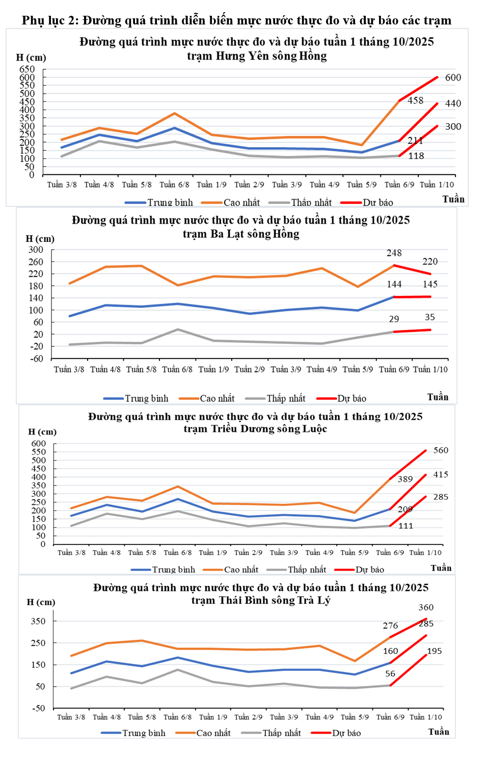 - Diễn biến xu thế mực nước trên sông Hồng, sông Luộc, sông Trà Lý trong thời hạn dự báo (từ ngày 01 đến 05/10/2025): Mực nước trên các sông dao động theo thủy triều, điều tiết của hồ thủy điện, lũ trên thượng nguồn: Mực nước lên và đạt đỉnh trong 2 ngày đầu (xấp xỉ TBNN) sau đó xuống dần vào 3 ngày cuối. Mực nước trung bình tuần các trạm đa số cao hơn TBNN và CKNT.