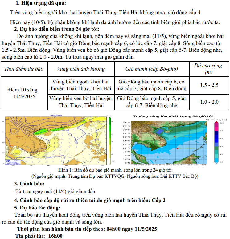 TIN GIÓ MẠNH TRÊN VÙNG BIỂN TỈNH THÁI BÌNH (16h00 NGÀY 10/5/2025)