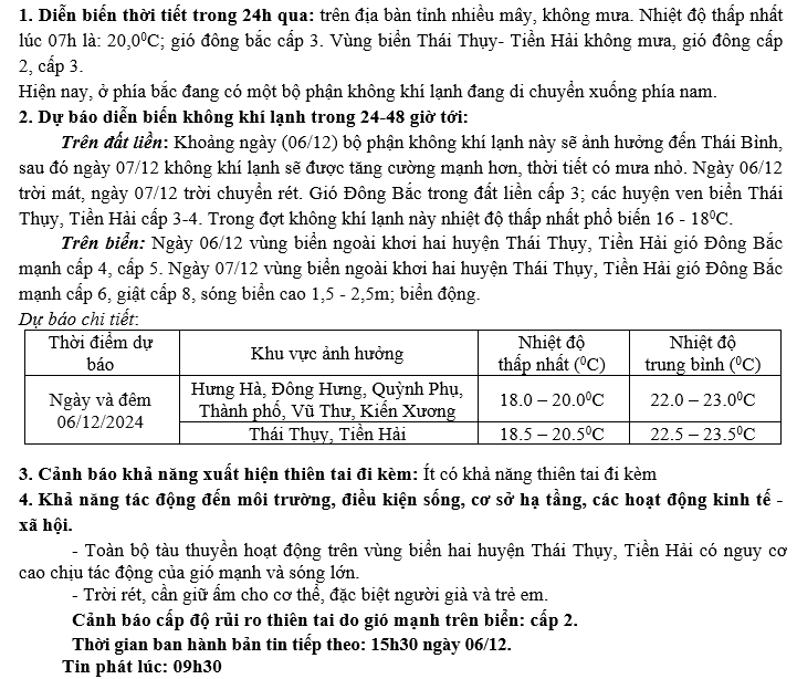 TIN GIÓ MÙA ĐÔNG BẮC TỈNH THÁI BÌNH (09h30 NGÀY 05/12/2024)