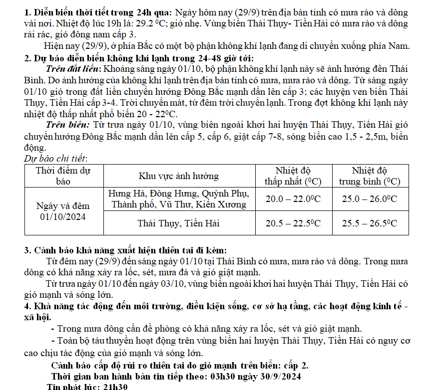TIN GIÓ MÙA ĐÔNG BẮC KHU VỰC TỈNH THÁI BÌNH (21h30 ngày 29/9/2024)