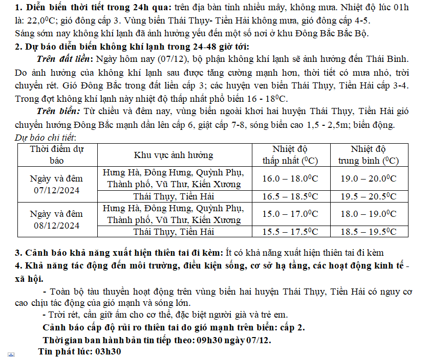 TIN GIÓ MÙA ĐÔNG BẮC TỈNH THÁI BÌNH (03h30 ngày 07/12/2024)