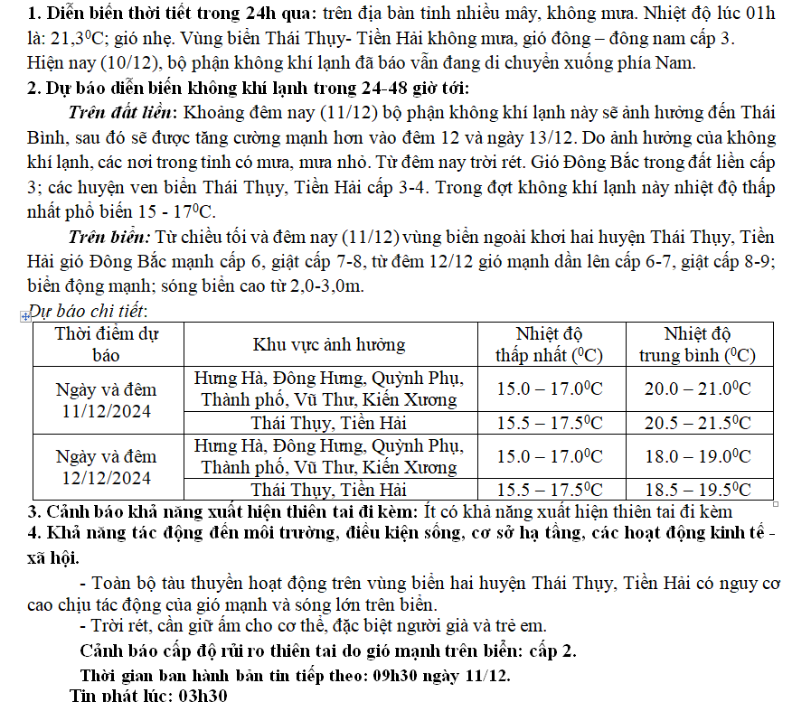 TIN GIÓ MÙA ĐÔNG BẮC TỈNH THÁI BÌNH (03h30 ngày 11/12/2024)