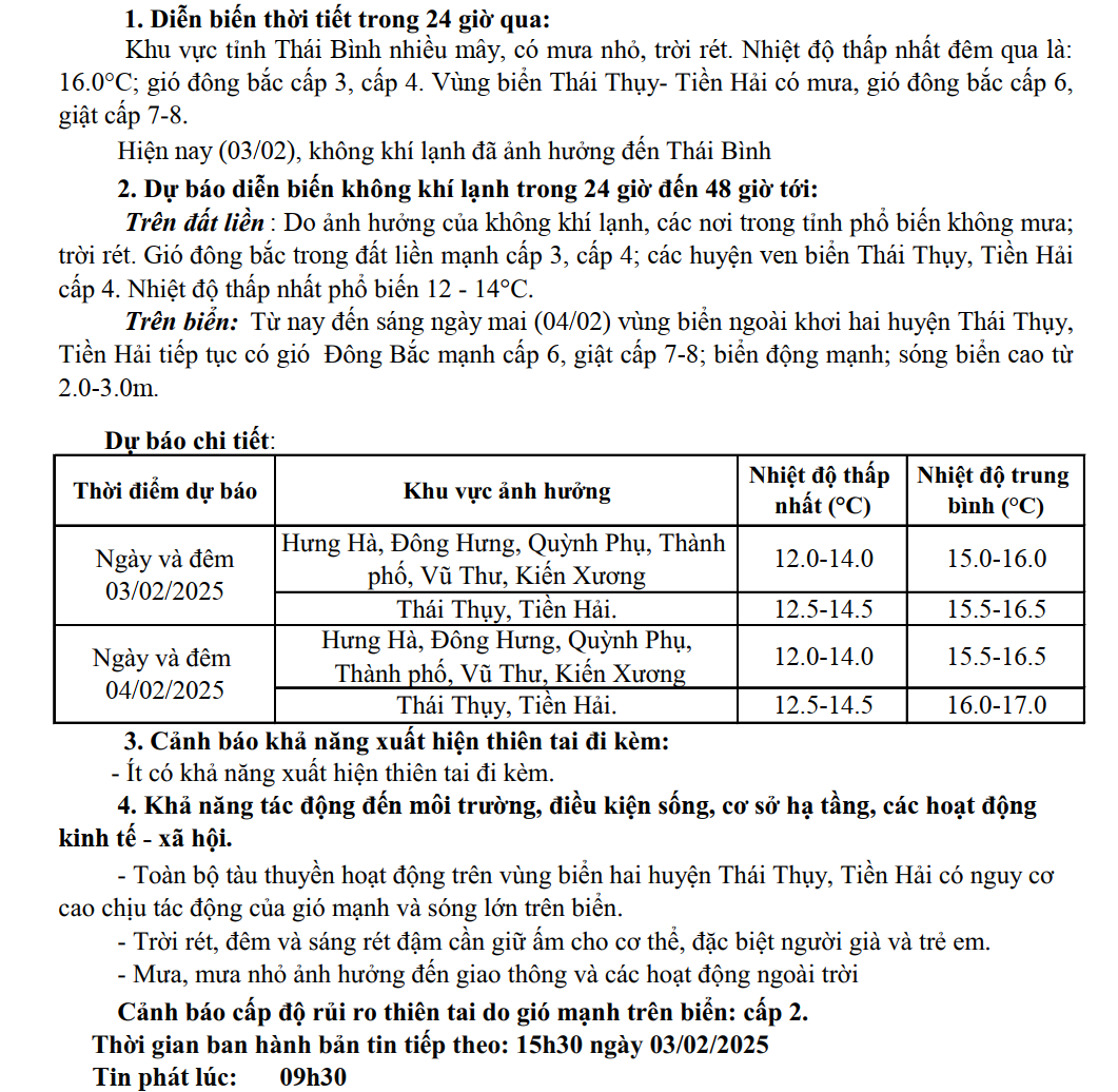 TIN GIÓ MÙA ĐÔNG BẮC TỈNH THÁI BÌNH (09h30 ngày 03/02/2025)