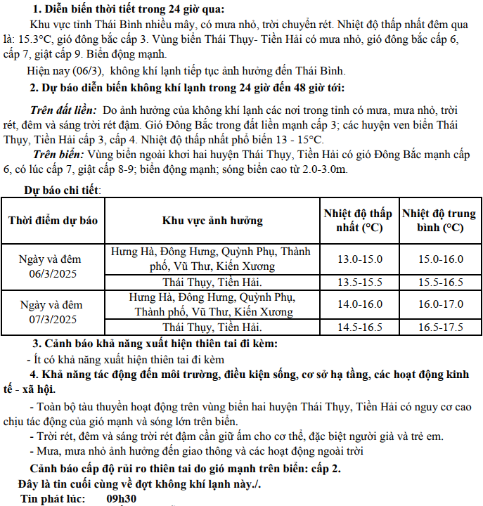 TIN GIÓ MÙA ĐÔNG BẮC TỈNH THÁI BÌNH (09h30 ngày 06/03/2025) Tin cuối!