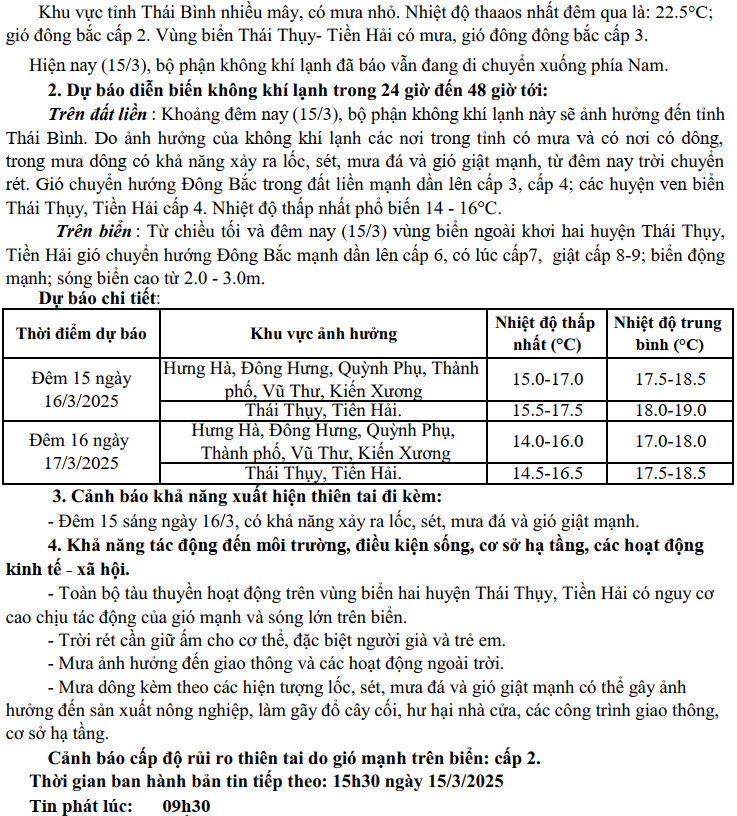TIN GIÓ MÙA ĐÔNG BẮC TỈNH THÁI BÌNH (09h30 ngày 15/03/2025)