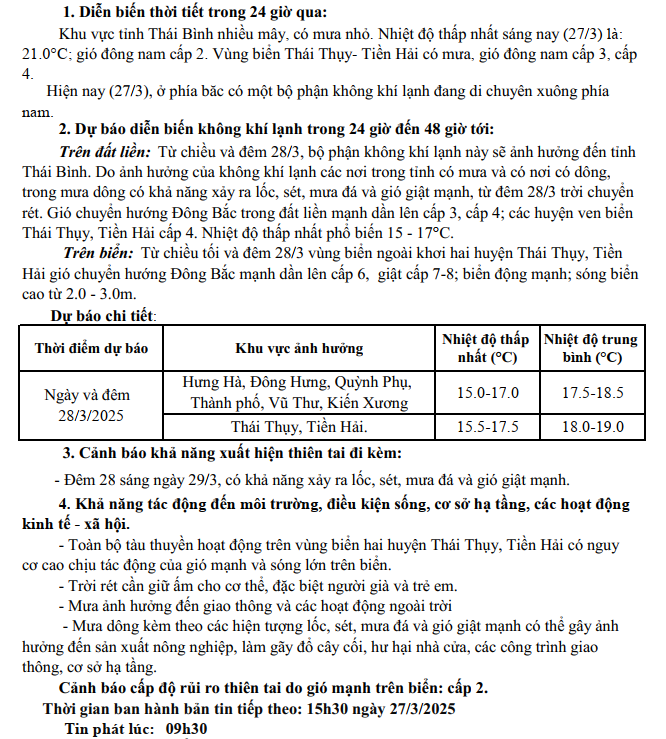 TIN GIÓ MÙA ĐÔNG BẮC TỈNH THÁI BÌNH (09h30 ngày 27/03/2025)