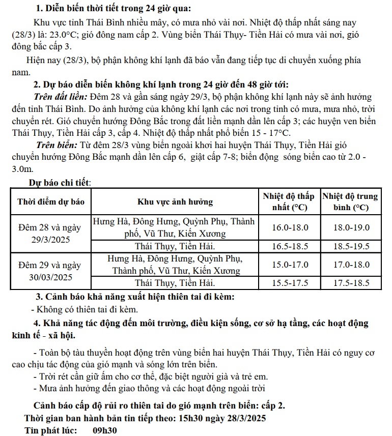 TIN GIÓ MÙA ĐÔNG BẮC TỈNH THÁI BÌNH (09h30 ngày 28/03/2025)
