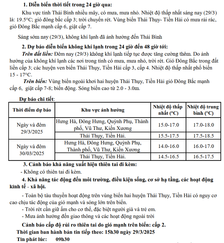 TIN GIÓ MÙA ĐÔNG BẮC TỈNH THÁI BÌNH (09h30 ngày 29/03/2025)