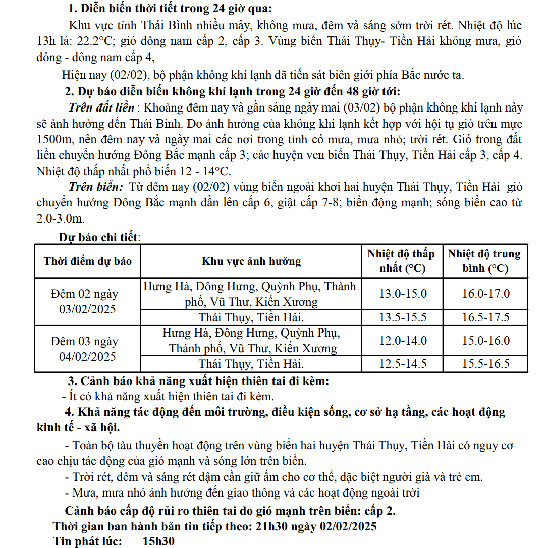 TIN GIÓ MÙA ĐÔNG BẮC TỈNH THÁI BÌNH (15h30 ngày 02/02/2025)