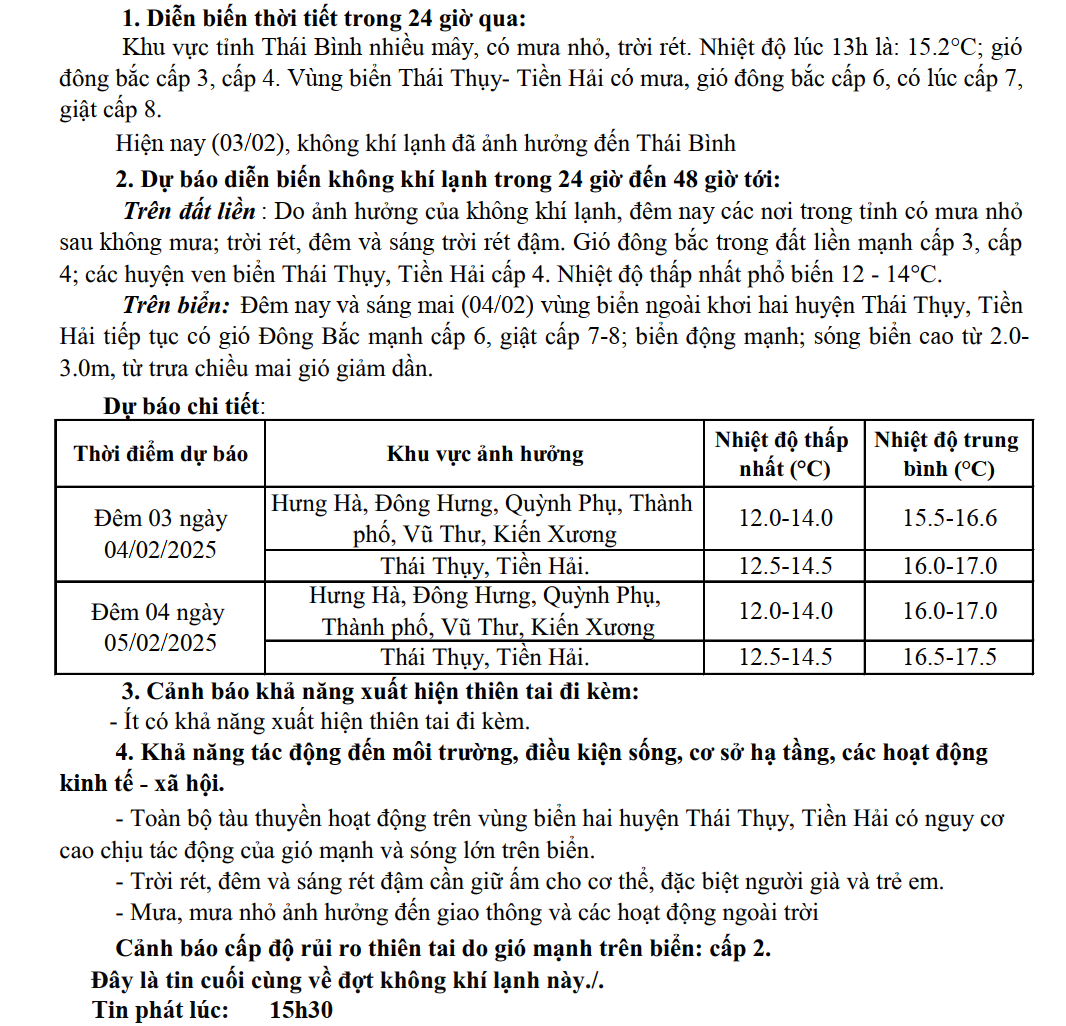 TIN GIÓ MÙA ĐÔNG BẮC TỈNH THÁI BÌNH (15h30 ngày 03/02/2025)