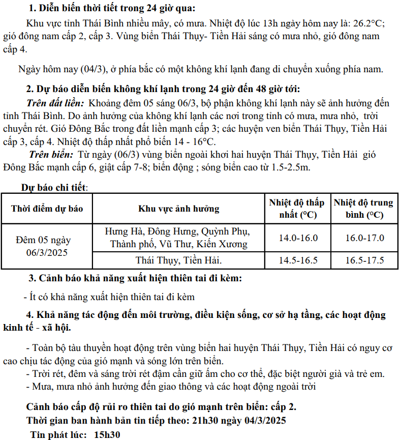 TIN GIÓ MÙA ĐÔNG BẮC TỈNH THÁI BÌNH (15h30 ngày 04/03/2025)