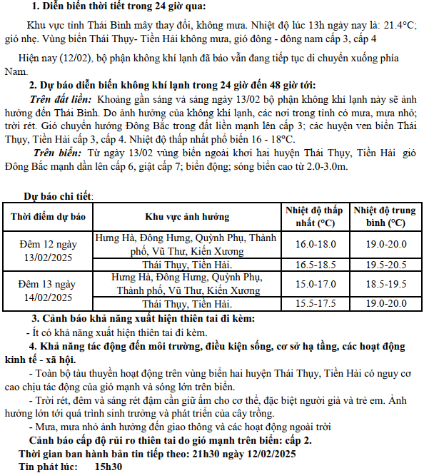 TIN GIÓ MÙA ĐÔNG BẮC TỈNH THÁI BÌNH (15h30 ngày 12/02/2025)