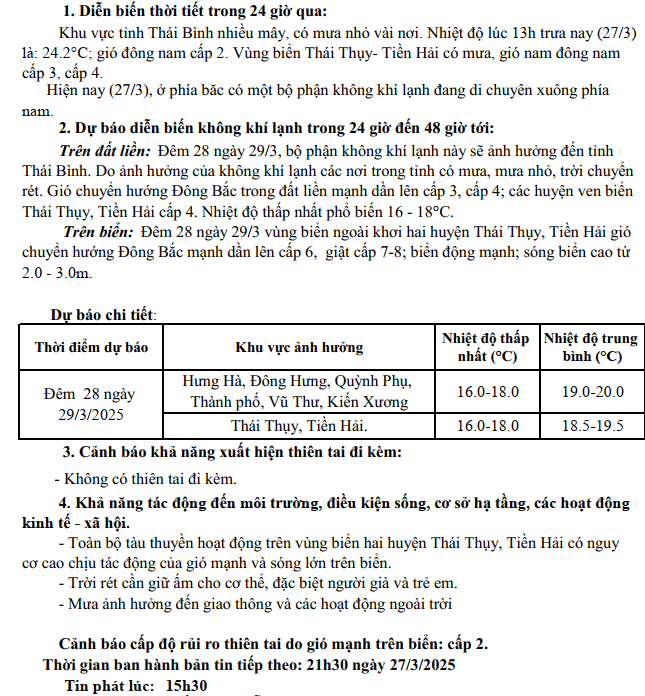 TIN GIÓ MÙA ĐÔNG BẮC TỈNH THÁI BÌNH (15h30 ngày 27/03/2025)