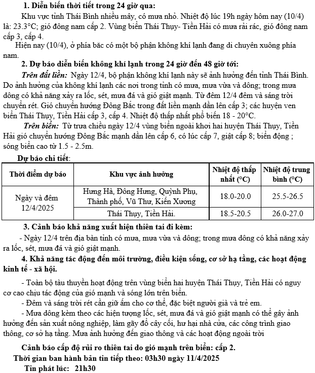 TIN GIÓ MÙA ĐÔNG BẮC TỈNH THÁI BÌNH (21h30 ngày 10/04/2025)