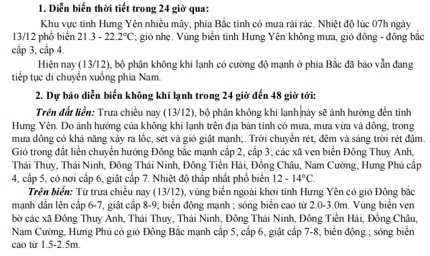 • TIN GIÓ MÙA ĐÔNG BẮC VÀ RÉT KHU VỰC TỈNH HƯNG YÊN (15h30 NGÀY 13/12/2025)