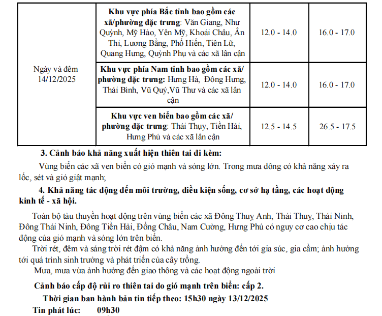 • TIN GIÓ MÙA ĐÔNG BẮC VÀ RÉT KHU VỰC TỈNH HƯNG YÊN (09h30 NGÀY 14/12/2025)