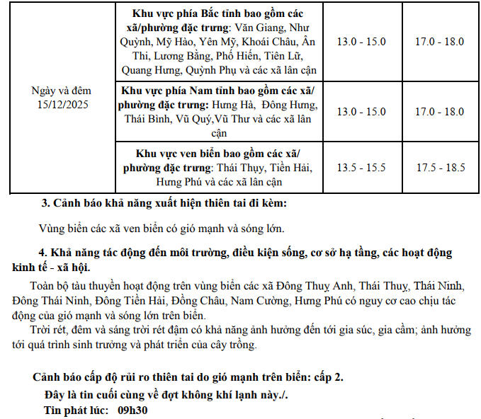 • TIN GIÓ MÙA ĐÔNG BẮC VÀ RÉT KHU VỰC TỈNH HƯNG YÊN (15h30 NGÀY 13/12/2025)