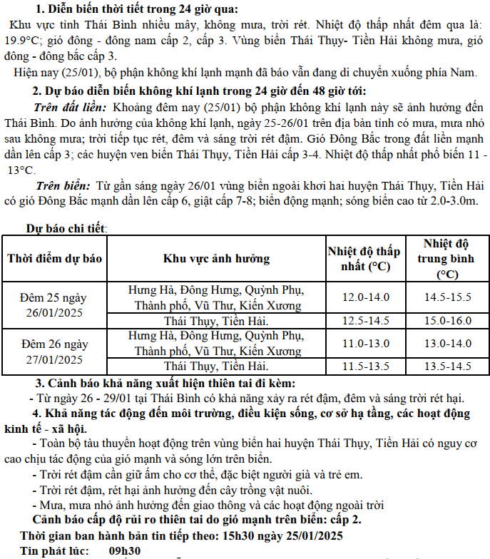 TIN GIÓ MÙA ĐÔNG BẮC VÀ RÉT TỈNH THÁI BÌNH (03h30 ngày 25/01/2025)