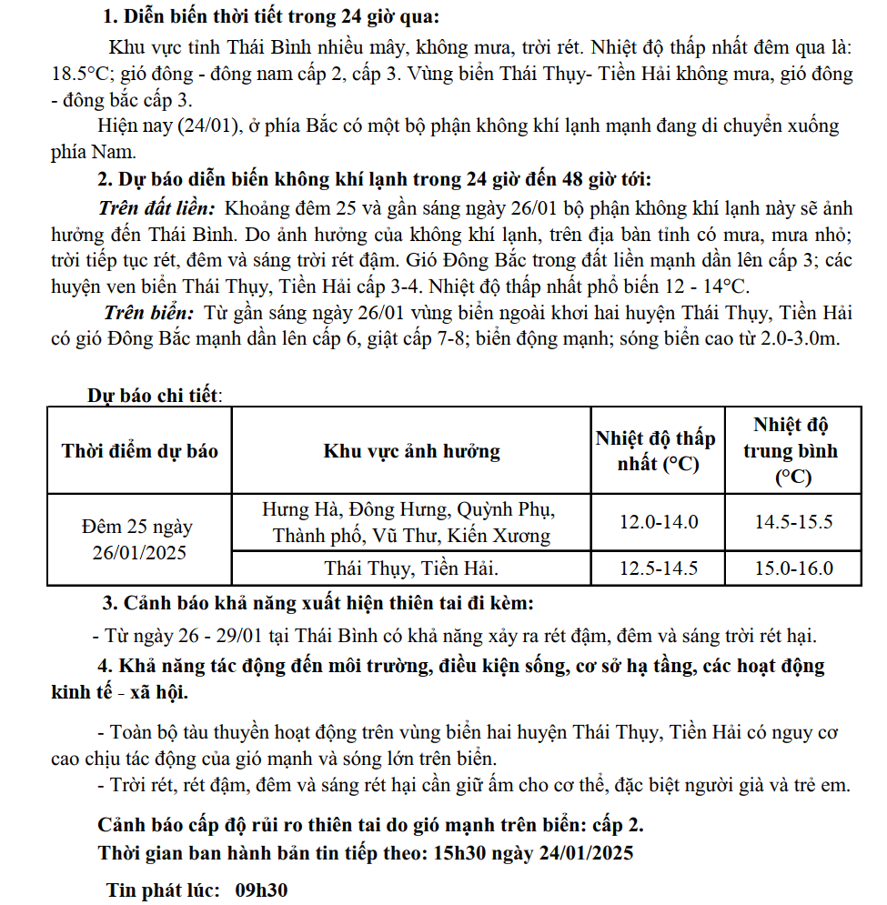 TIN GIÓ MÙA ĐÔNG BẮC VÀ RÉT TỈNH THÁI BÌNH (09h30 ngày 24/01/2025)