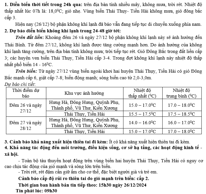 TIN KHÔNG KHÍ LẠNH TĂNG CƯỜNG TỈNH THÁI BÌNH (09h30 NGÀY 26/12/2024)