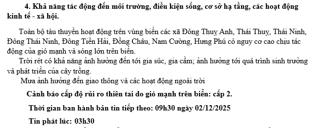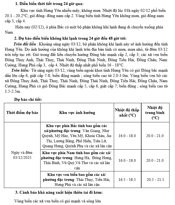 TIN KHÔNG KHÍ LẠNH TĂNG CƯỜNG KHU VỰC TỈNH HƯNG YÊN (03h30 NGÀY 02/12/2025)
