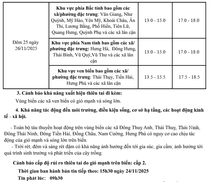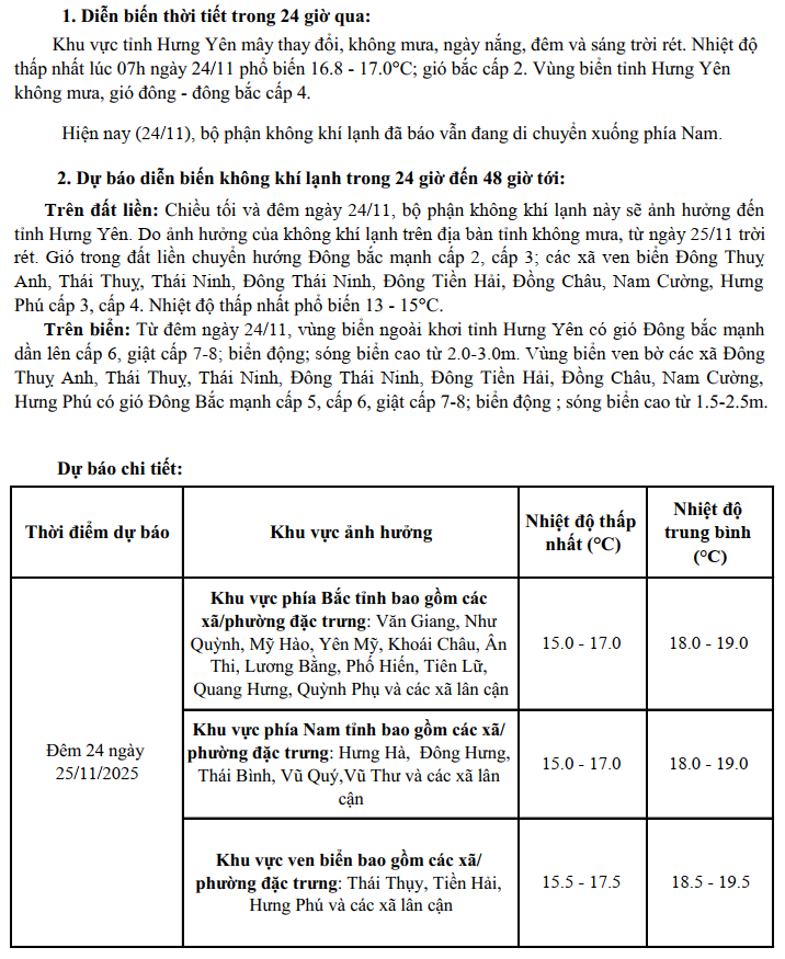 TIN KHÔNG KHÍ LẠNH TĂNG CƯỜNG KHU VỰC TỈNH HƯNG YÊN (09h30 NGÀY 24/11/2025)