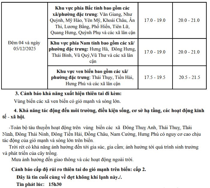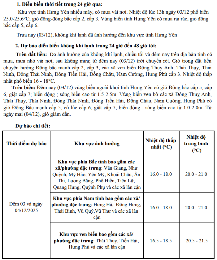 TIN KHÔNG KHÍ LẠNH TĂNG CƯỜNG KHU VỰC TỈNH HƯNG YÊN (15h30 NGÀY 03/12/2025)