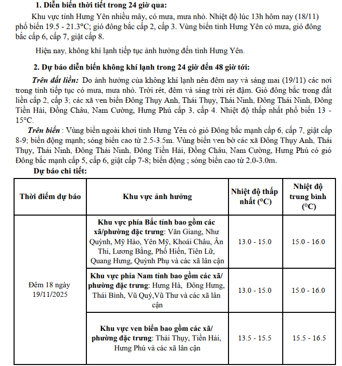 TIN KHÔNG KHÍ LẠNH TĂNG CƯỜNG KHU VỰC TỈNH HƯNG YÊN (15h30 NGÀY 18/11/2025)